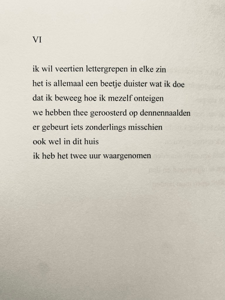 Boelsma’s vers boeit me omdat het poëtisch scheppingsproces me boeit. Bovendien is er zeer scherp waargenomen: de totstandkoming wordt precies uitgelegd. En de poëzie? Die zit vooral in de middelste regel, die een vleugje tederheid in het spel brengt en maar blijft rondzingen in mijn hoofd: ‘we hebben thee geroosterd op dennennaalden’. Boelsma heeft ons een rijk gedicht geschonken.