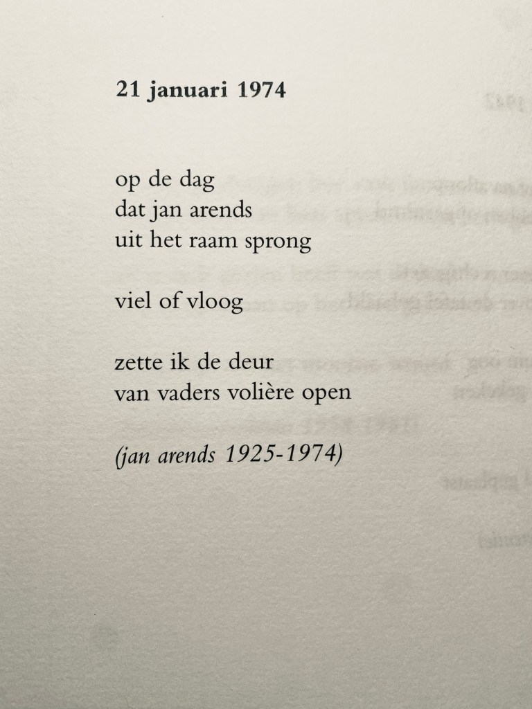 Op 21 januari 1974 sprong of viel dichter-schrijver Jan Arends ’s avonds uit een raam van zijn flatwoning op de vijfde verdieping. Hij overleefde het niet. Er zijn aanwijzingen dat het zelfdoding was. 49 was-ie. Zijn literaire werk begon net de aandacht van publiek en kritiek te trekken. Op de dag van zijn sprong of val was zijn bundel Lunchpauzegedichten bij De Bezige Bij verschenen.