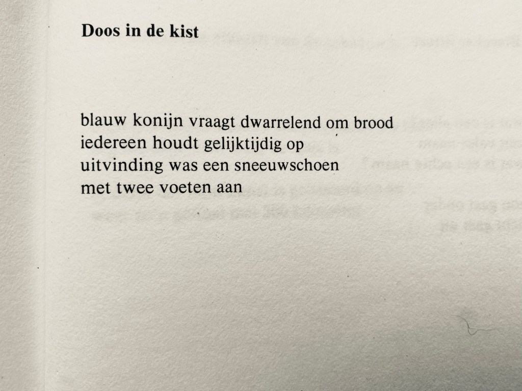 Gedicht van Engelsman Tom Raworth (1938-2017), vertaald door Peter Nijmeijer, uit de bundel Live uit Athene (1978, De Bezige Bij). (Toen het uitgeven van buitenlandse experimentele poëzie kennelijk nog lonend was.)