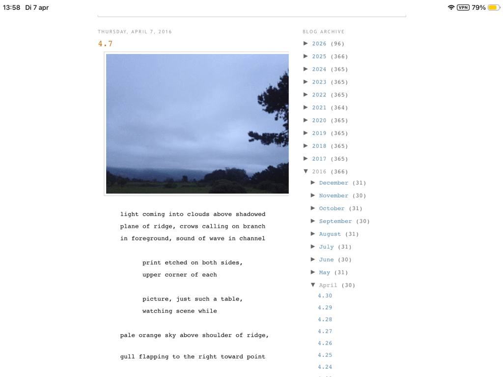 De Californische dichter Stephen Ratcliffe (1948) post sinds mensenheugenis dagelijks een gedicht op zijn blog Temporality, vergezeld van een foto die is genomen vanaf een vaste plek in zijn huis. De gedichten worden per duizend stuks gebundeld in vuistdikke paperbacks en giga elektronische bestanden. Hoewel de gedichten per boek van structuur veranderen, blijft Ratcliffe inhoudelijk de focus vooral leggen op wat hij waarneemt. Het gedicht hieronder postte hij precies tien jaar geleden en is exemplarisch voor alle gedichten die Ratcliffe in het kader van dit fascinerende waanzinnige project schreef: