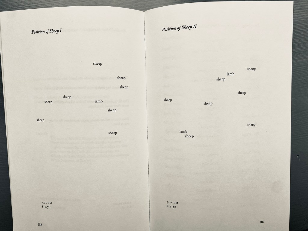 Tijdens een voorjaarstrip naar het Lake District ‘componeerde’ Canadees Steve McCaffery (1947) enkele gedichten, die hij in In Engeland Now That Spring (1979) opnam. McCaffery’s omvangrijke oeuvre, dat nog altijd uitdijt, is experimenteel van aard. Met betrekking tot vorm en inhoud heeft hij van alles uitgeprobeerd. De gedichten ‘Position of Sheep I’ en ‘II’ geven de posities weer, met een tussenpoos van vier minuten, van dezelfde negen schapen, die hij daar moet hebben gezien. Uit de positieveranderingen maak ik op dat ze niet lagen, maar graasden. Bovendien had McCarthy zich vergist: één schaap bleek bij nadere bestudering een lam te zijn.