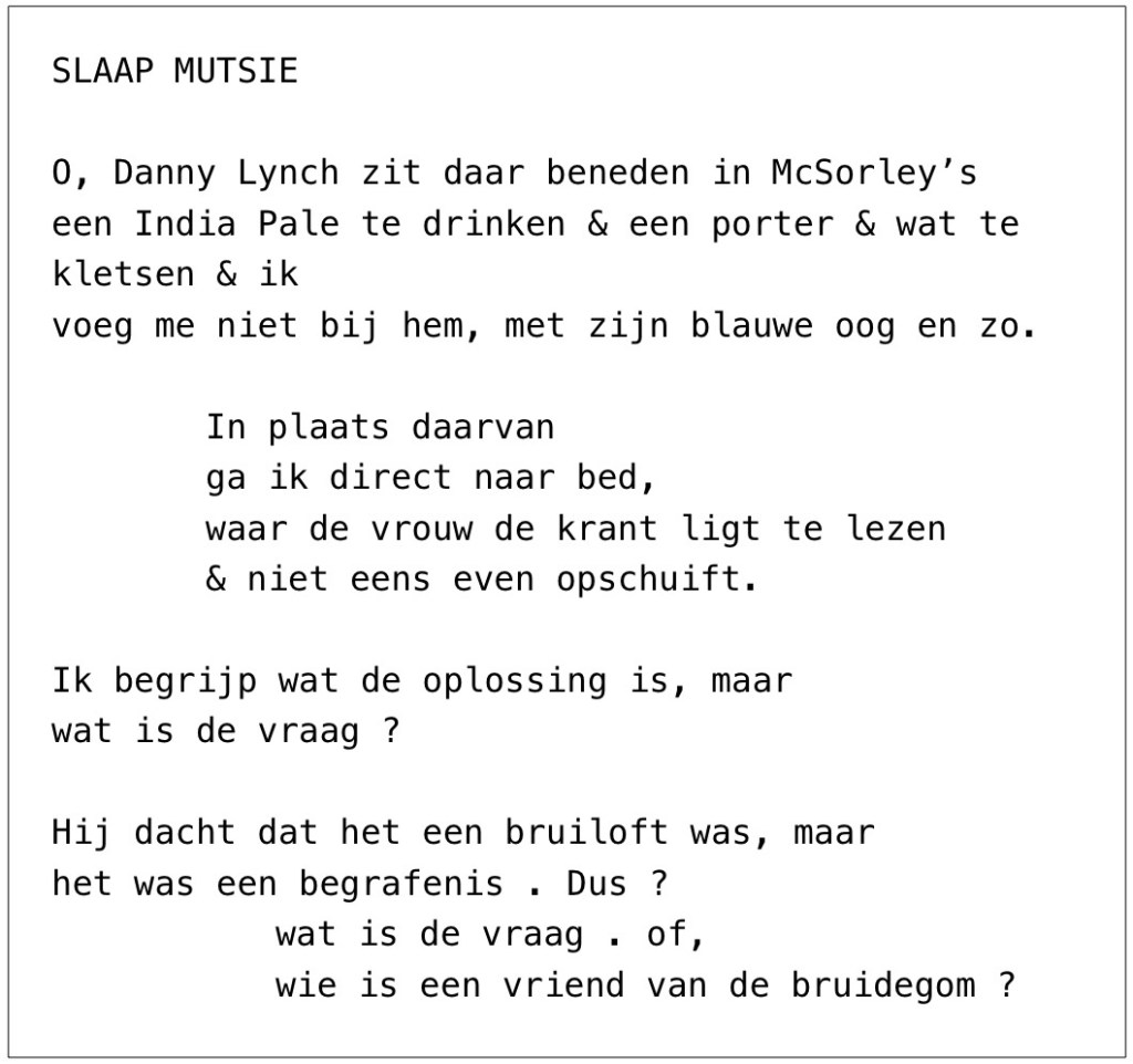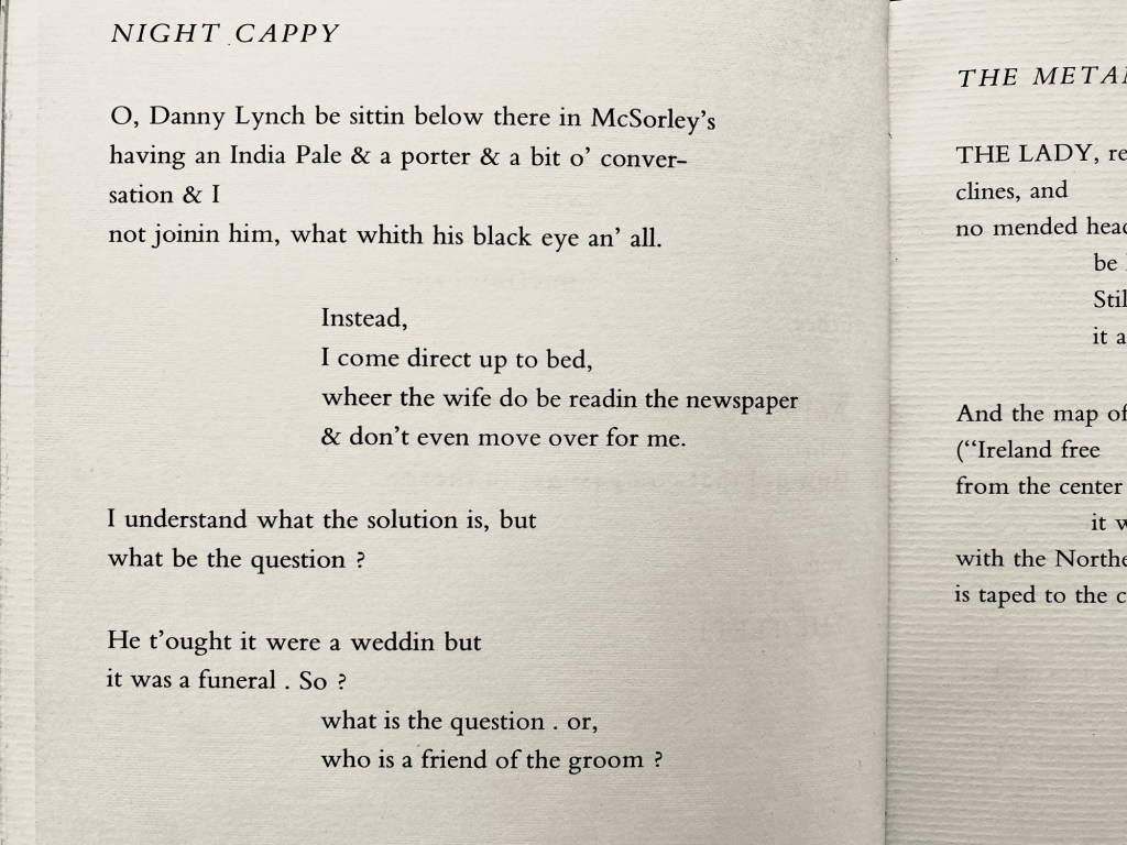 Het bierhuis dat Paul Blackburn in de jaren zestig regelmatig bezocht, McSorley’s Old Ale House, bestaat nog altijd en is het oudste bierhuis van Manhattan. In het gedicht ‘Night Cappy’ uit de bundel In . On . Or About the Premises besluit zuipschuit Blackburn om eens níet naar de kroeg te gaan, waar zijn drinkebroer Danny Lynch zit, maar in plaats daarvan zijn vrouw Sarah Golden een avond gezelschap te houden. Golden was Blackburns tweede echtgenote, van wie hij vlak voor het verschijnen van In . On . Or About the Premises scheidde. In ‘Night Cappy’ wil het al niet meer boteren tussen die twee.
