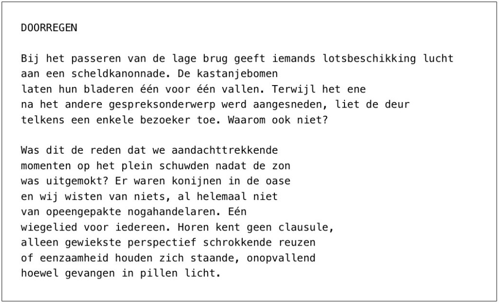 Hoewel de eerste strofe met een schouderophalen eindigt, worden in de tweede enkele nare consequenties van slechthorendheid uit de doeken gedaan. Het mijden van ‘aandachttrekkende / momenten’, waarop het een lawaaiige drukte van belang is, lijdt tot vereenzaming. Nieuwtjes blijven uit en ‘perspectief schrokkende reuzen’ verengen je wereld. Vaak verloopt een achteruitgang van het gehoor sluipenderwijs en kan niet of nauwelijks worden gekeerd. Geen olijk gedicht, wel uit het leven gegrepen.