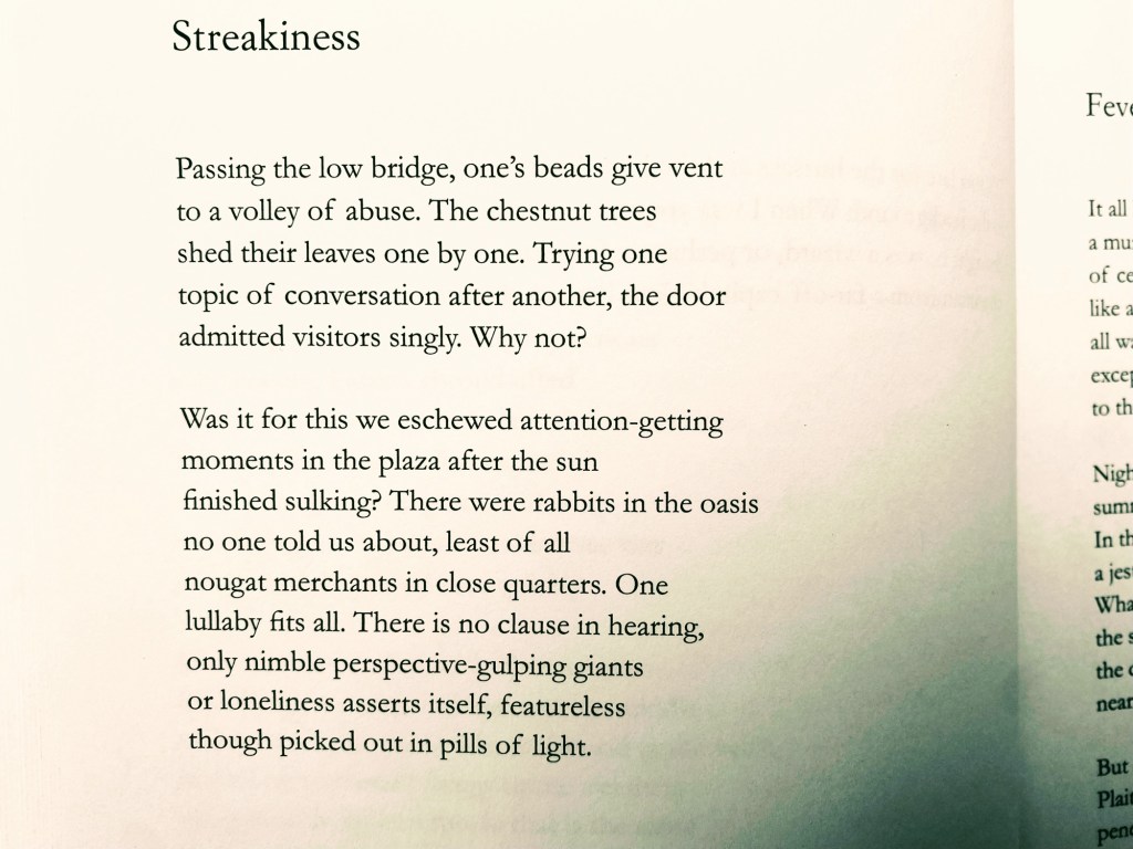 Het derde gedicht uit A Worldly Country heet ‘Streakiness’ en kaart ouderdomskwalen aan. Ashbery was een grote, zware man, die op z’n tachtigste menig pondje vet met zich mee torste.