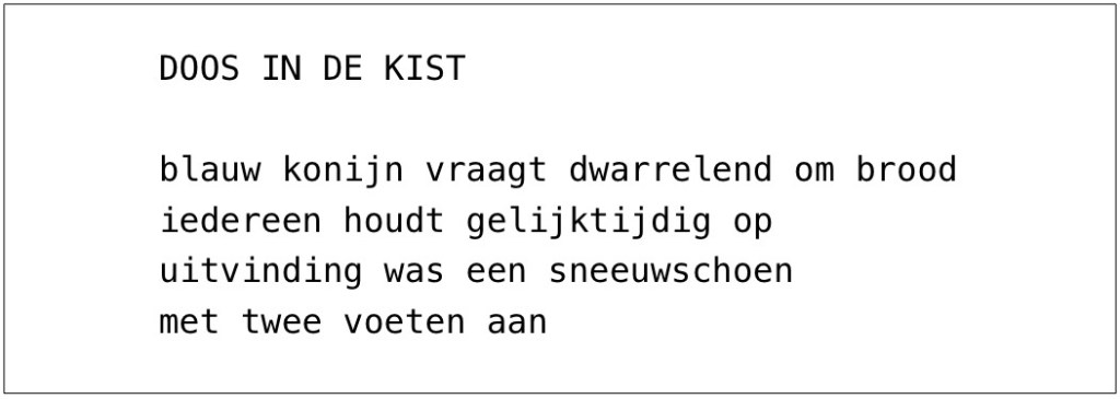 Gedicht van Engelsman Tom Raworth (1938-2017), vertaald door Peter Nijmeijer, uit de bundel Live uit Athene (1978, De Bezige Bij). (Toen het uitgeven van buitenlandse experimentele poëzie kennelijk nog lonend was.)